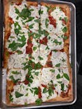 Arugula, onions, chopped tomato, shaved Parmesan cheese, roasted peppers & tomato sauce.